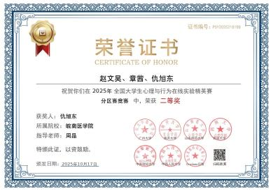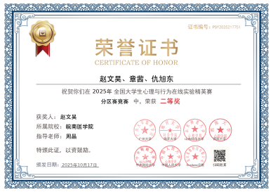 近日,2025年第三届全国大学生心理与行为在线实验精英赛东部赛区赛圆满举行。由我院2023级基础医学专业赵文昊、仇旭东联合法医学院2023级法医学专业章茜组成的“心理•丝阔特”团队斩获二等奖,展现了我校学子扎实的专业素养、丰富的创新能力。