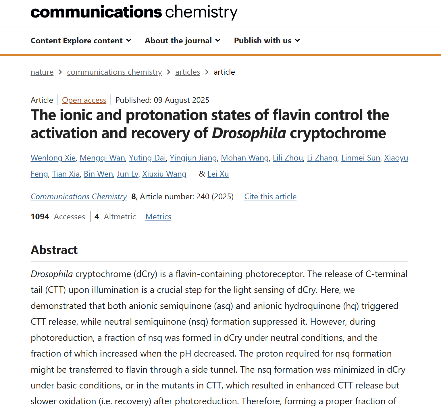 近日,生化教研室徐蕾教授团队在Nature子刊Communications Chemistry(IF = 6.2,中科院一区Top期刊)发表题为《The ionic and protonation states of flavin control the activation and recovery of Drosophila cryptochrome》的研究论文,阐释了果蝇生物钟蛋白隐色素的作用机制。我校2025届生物化学与分子生物学专业研究生谢文龙、2024届药物制剂专业本科生万梦琪(现为2025级药理学专业研究生)为共同第一作者,人体解剖学教研室王秀秀、生化教研室徐蕾教授为通讯作者。