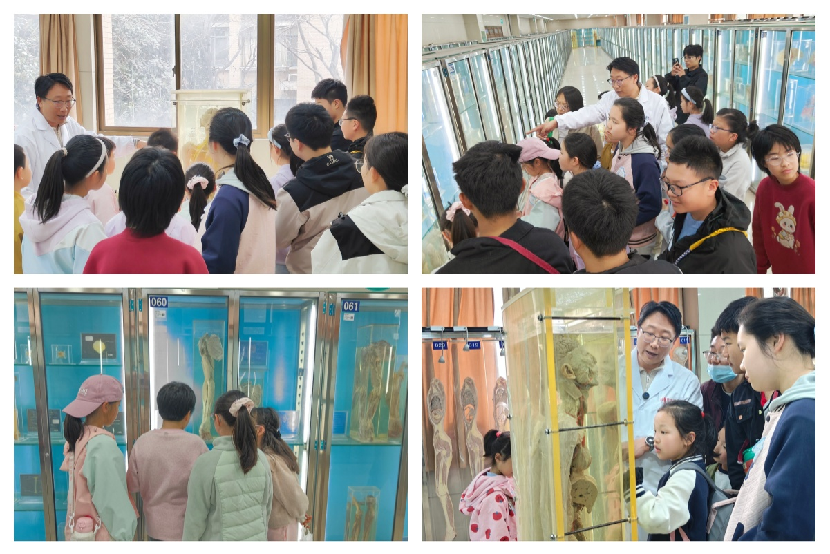 下午,活动转入室内场馆参观环节。在人体解剖学党支部王继胜老师的带领下,孩子们有序走进人体解剖标本馆,开启了一场“认识自我”的探索之旅。王老师以严谨而温和的语气,结合标本实物,向孩子们详细介绍了人体各系统器官的结构与功能,讲解了人体标本的医学研究意义,引导孩子们树立敬畏生命、尊重科学、探索医学的正确观念。参观过程中,孩子们神情专注,不时驻足观察、主动提问,对人体结构的好奇心被充分激发,展现出对医学知识的浓厚兴趣,王老师也耐心细致地逐一解答孩子们的疑问,让科普知识入脑入心。