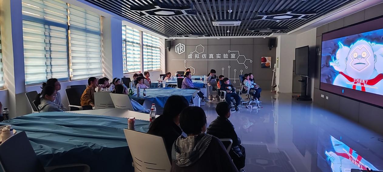 参观结束后,孩子们返回虚拟仿真实验室,共同观看了动画电影《浪浪山小妖怪》。影片以轻松有趣的故事情节、温暖治愈的画面,传递了勇气、坚持与成长的正能量,孩子们看得目不转睛,不时发出阵阵笑声。观影间隙,机能学实验实训中心还特意安排了小兔子互动环节,孩子们小心翼翼地抚摸、投喂小兔子,尽显童心与爱心,现场氛围温馨而欢乐,让孩子们在紧张的研学之余感受到了别样的温暖。