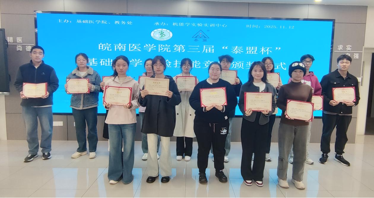 11月8日,由机能学实验实训中心承办的第三届“泰盟杯”基础医学实验技能竞赛在滨江校区(北区)1号实验楼顺利闭幕。比赛共吸引来自全校各专业的308名本科生踊跃报名参赛,经过激烈角逐,最终评选出一等奖4支队伍、二等奖5支队伍、三等奖6支队伍。